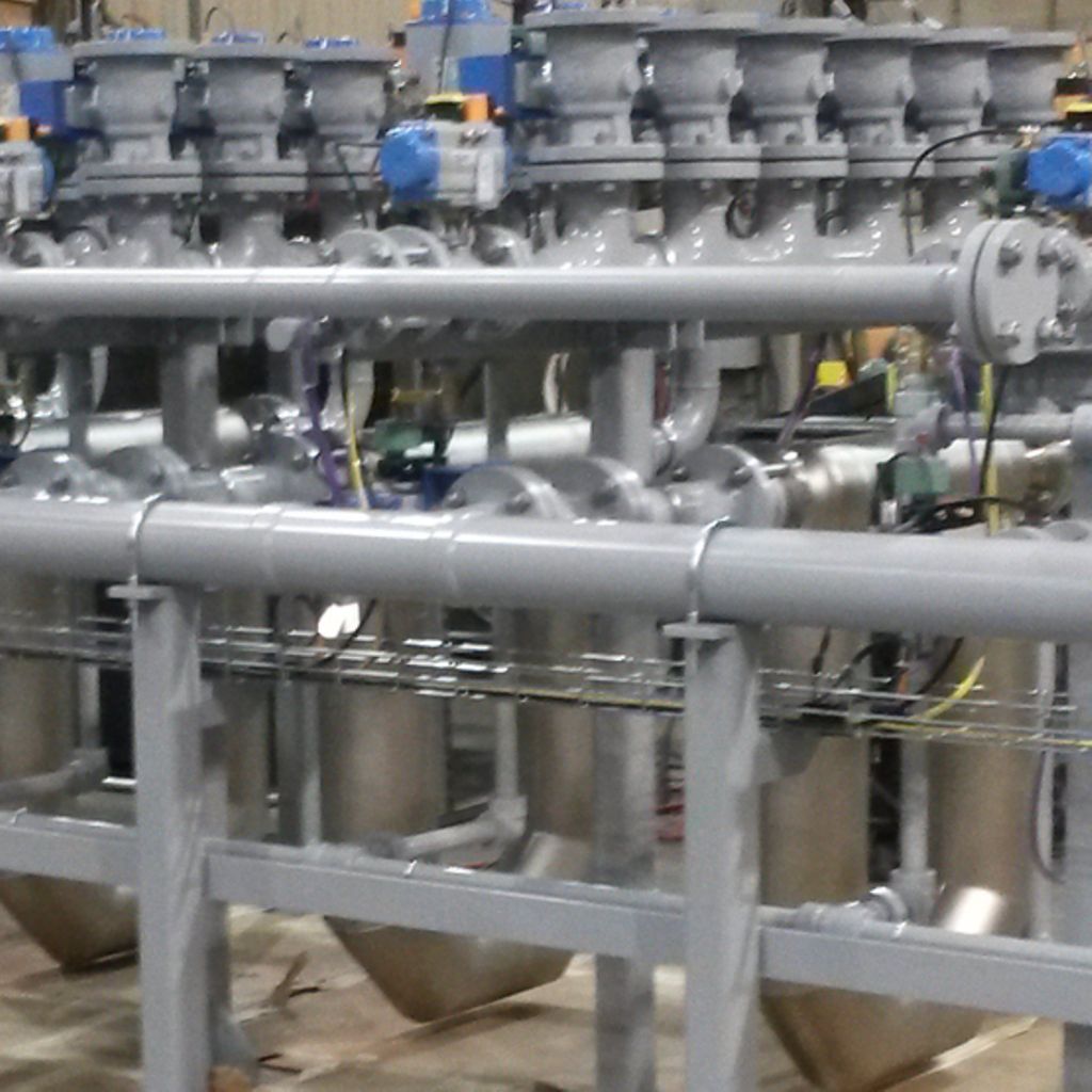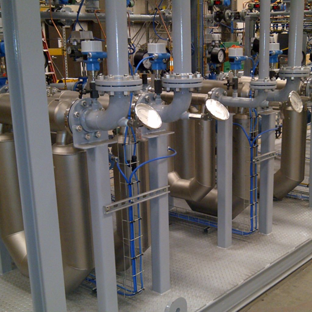 Simultaneous Metered Blenders are a small pipeline skidded solution utilizing Micro Motion Coriolis flow meters and controls to dose the correct ratio of components into a header at the same time before discharging for further mixing.